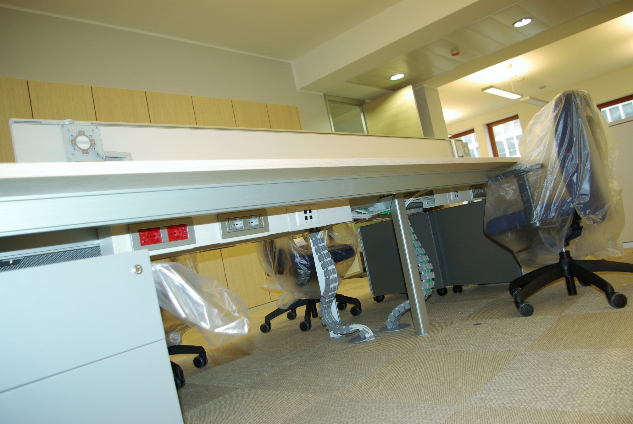 Le prese di energia e di trasmissione dati non devono costituire intralcio ed è bene che i cavi siano protetti. Nella foto si notano le particolari canalizzazioni denominate “vertebre” che dal pavimento portano i cavi alle canaline poste sotto le scrivanie