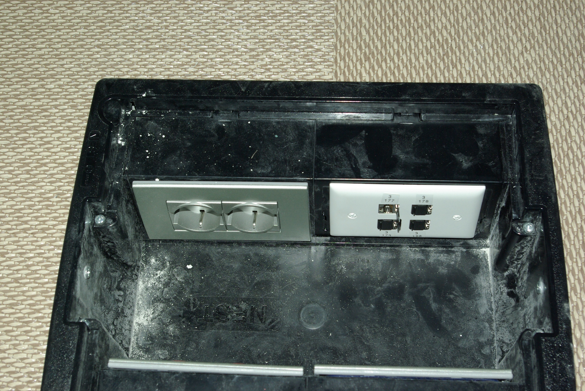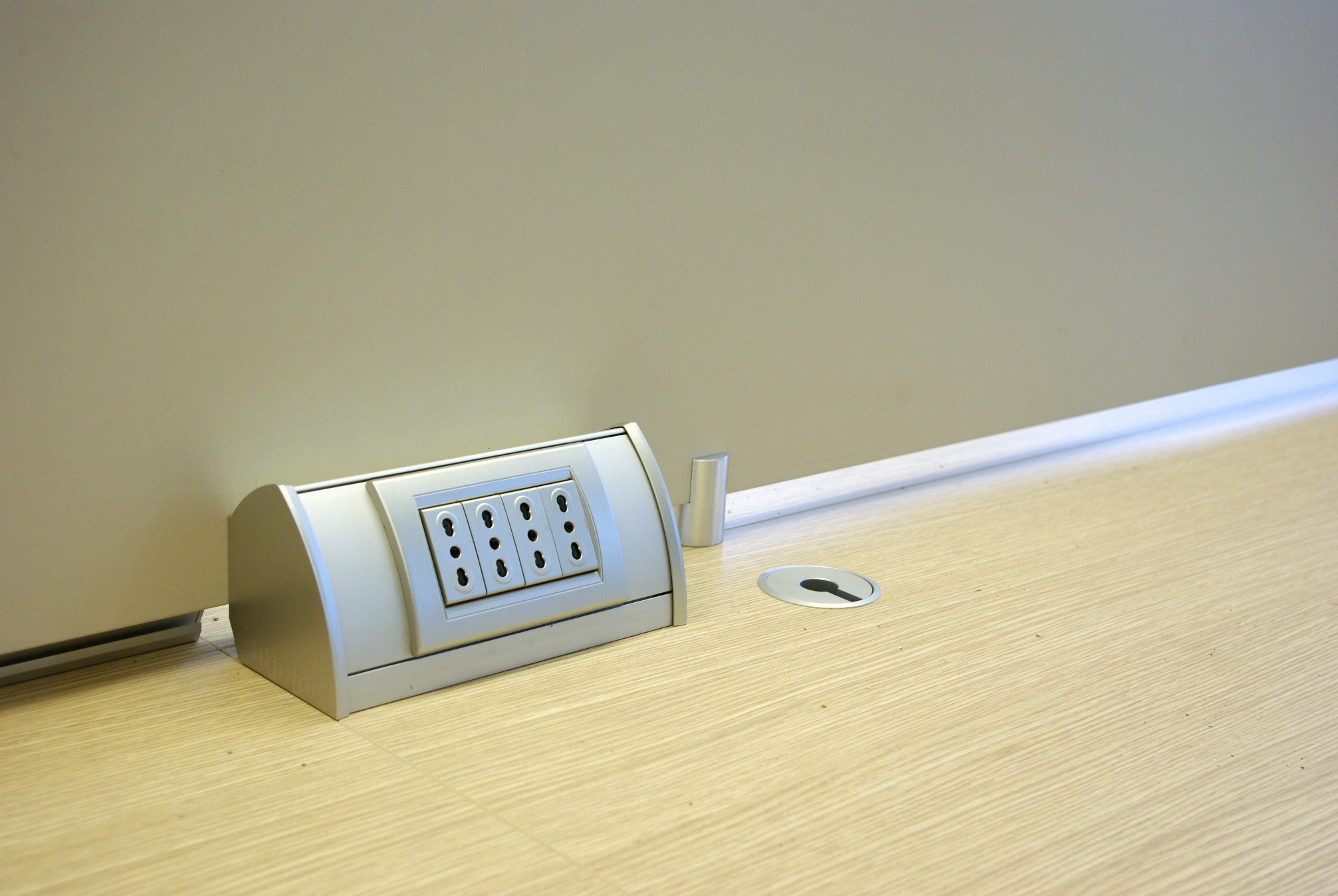 Quando la particolare conformazione delle scrivanie non consente la posa sotto il piano dei tavoli, una soluzione ottimale è costituita dalle cosiddette “torrette a scomparsa”Particolare delle prese sopra i tavoli