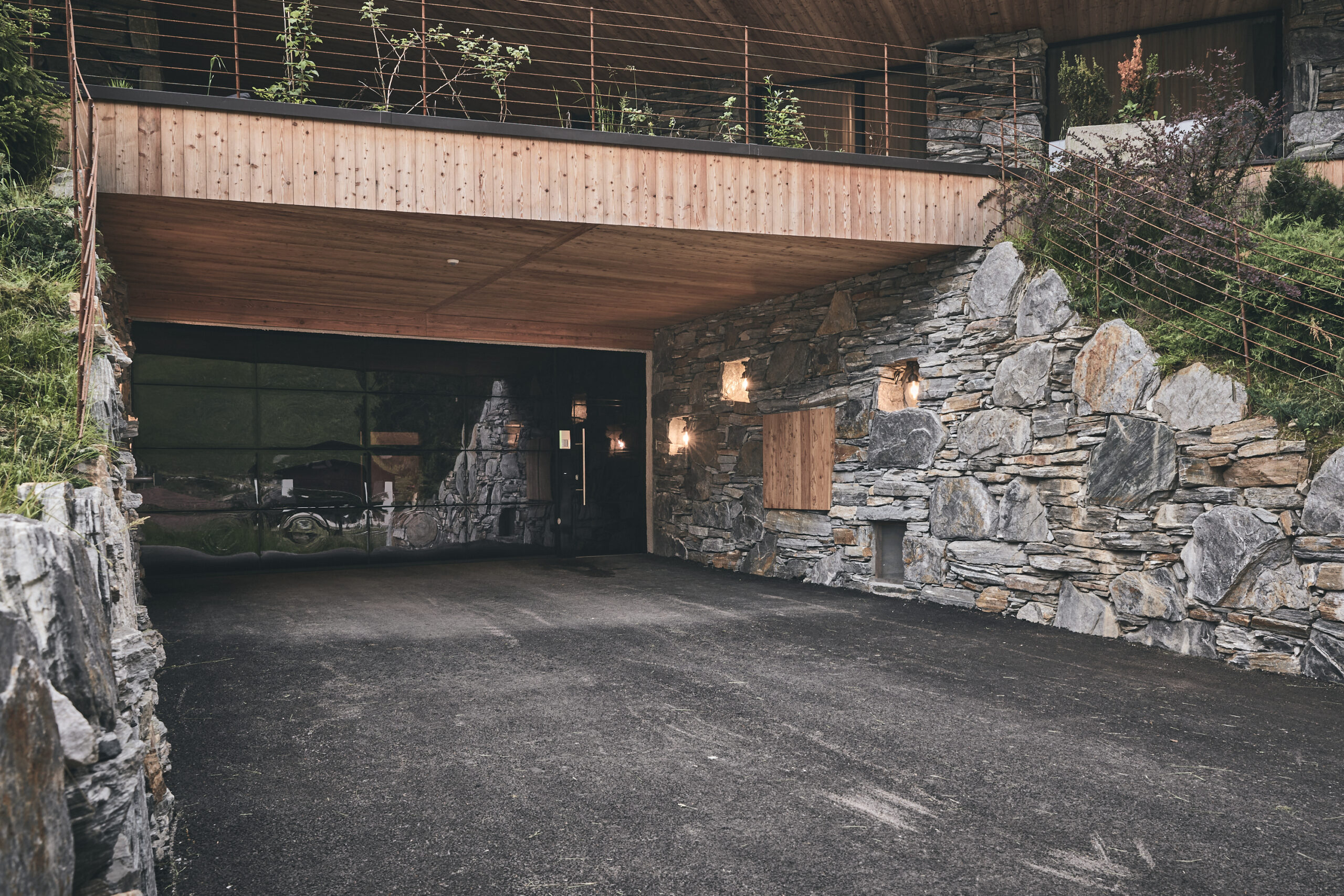 È il caso, ad esempio, del garage situato al piano inferiore, che all’interno è stato completamente rivestito di legno naturale; l’ingresso carrabile, invece, risulta protetto da un portone sezionale Hörmann completamente trasparente, dotato di vetrate speculari che riflettono la natura circostante.