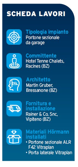 Tutto è stato caratterizzato da una fine progettazione, all’interno del Tenne Chalets di Racines di Dentro, in provincia di Bolzano, per il quale sono state scelte funzionali soluzioni di pregio, come l’esclusivo portone sezionale ALR F42 Vitraplan che funge da chiusura per il garage.