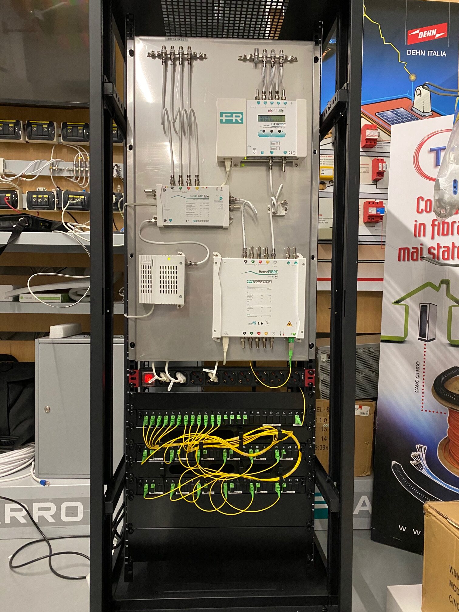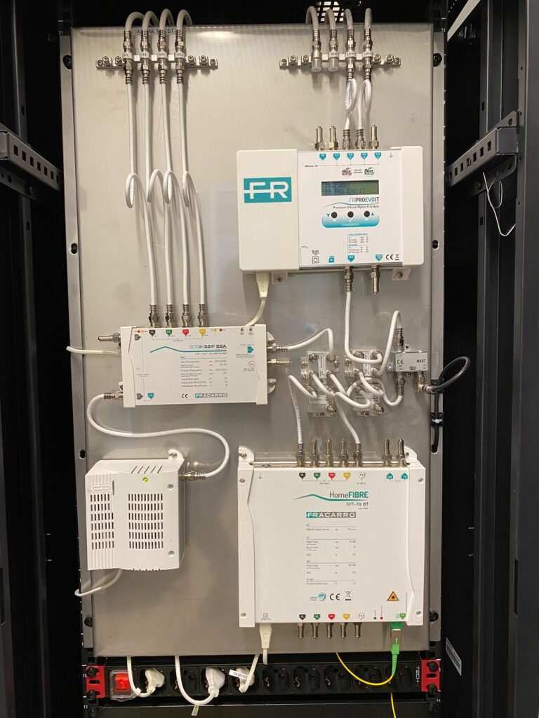 Avvalendosi di TV-Hotel con doppio tuner, si è deciso per un impianto miscelato con la parte SAT a conversione IF/IF per semplicità di distribuzione (dalle sottocentrali parte un solo cavo per appartamento e le tre prese interne vengono collegate tramite partitore in una scatola di derivazione posta internamente all’abitazione). Utilizzando prodotti di marca Fracarro Radioindustrie e vista la totale flessibilità dovuta alla tecnologia PRO EVO per i segnali TV terrestri e SCD2 per i segnali SAT, grazie alla perfetta equalizzazione, è stato facile ottimizzare i canali da distribuire. La posa e la saldatura della fibra è stata eseguita dalla ditta che ha fornito l’impianto LAN e, per facilitarne l’esecuzione a regola d’arte, è stata riprodotta una demo del cassetto ottico. L’impianto ricevente, installato nella sommità dell’edificio al 3° piano, è composto da due antenne LOG periodiche LP45F LTE – le uniche che, in questa particolare zona del Lago di Garda, hanno dato il miglior rapporto MER/cBER – e una parabola Penta 85 con LNB VH/VH orientata su Astra 19° Est, data la preferenza della clientela tedesca tipica di questa zona. Al piano terra, nel locale tecnico, sono presenti i quadri elettrici di gestione dell’impianto, del sistema fotovoltaico, dei dati e il rack contenente le centrali di testa 3DGFLEX TV/SAT. Per ridurre le attività in cantiere, la centrale di testa e le sottocentrali sono state assemblate, cablate e programmate in laboratorio: questo tipo di servizio si è reso necessario per minimizzare gli imprevisti in cantiere e curare nei minimi particolari tutte le fasi di installazione. In centrale sono stati attestati tutti i cavi coassiali provenienti dal tetto, quattro per il SAT, due per il TV e due di scorta per esigenze future. I segnali TV risultano filtrati ed equalizzati tramite FRPRO- EVO IT, selezionando i nove Mux principali, mentre i tredici trasponder SAT di Astra 19° Est sono selezionati tramite la centrale in conversione IF/ IF SCD2-32SSA. La miscelazione ha luogo a monte delle centrali, derivando due uscite per i montanti serviti da cavi coassiali, per poi alimentare il trasmettitore ottico OPT-TX. Il segnale ottico viene splittato su dieci montanti tramite il partitore ottico PLC 1×16; per ottimizzare i valori d’ingresso dei ricevitori ottici installati nelle sottocentrali è stato necessario interporre un attenuatore ottico da 3 dB.