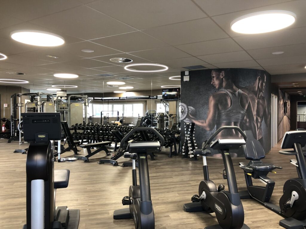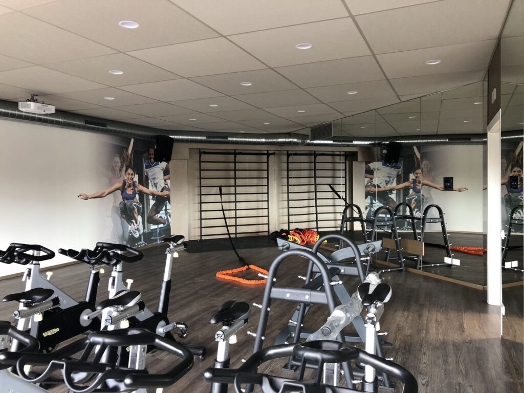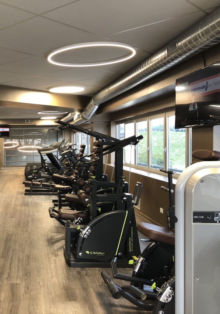 Al piano superiore si trova l’ampia palestra open space con macchinari selezionati di ultima generazione, illuminata da grandi vetrate, il tecnologico angolo lounge/bar e la saletta corsi con proiettore, per accedere ad attività di gruppo o private con personal trainer o video online. L’esigenza di un’evoluzione, nell’open space della palestra, dai due cerchi con solo luce perimetrale ai cerchi con luce centrale è stata riscontrata durante il cantiere, quando è stato necessario disporre di più luce, senza, però, creare un effetto di abbagliamento.