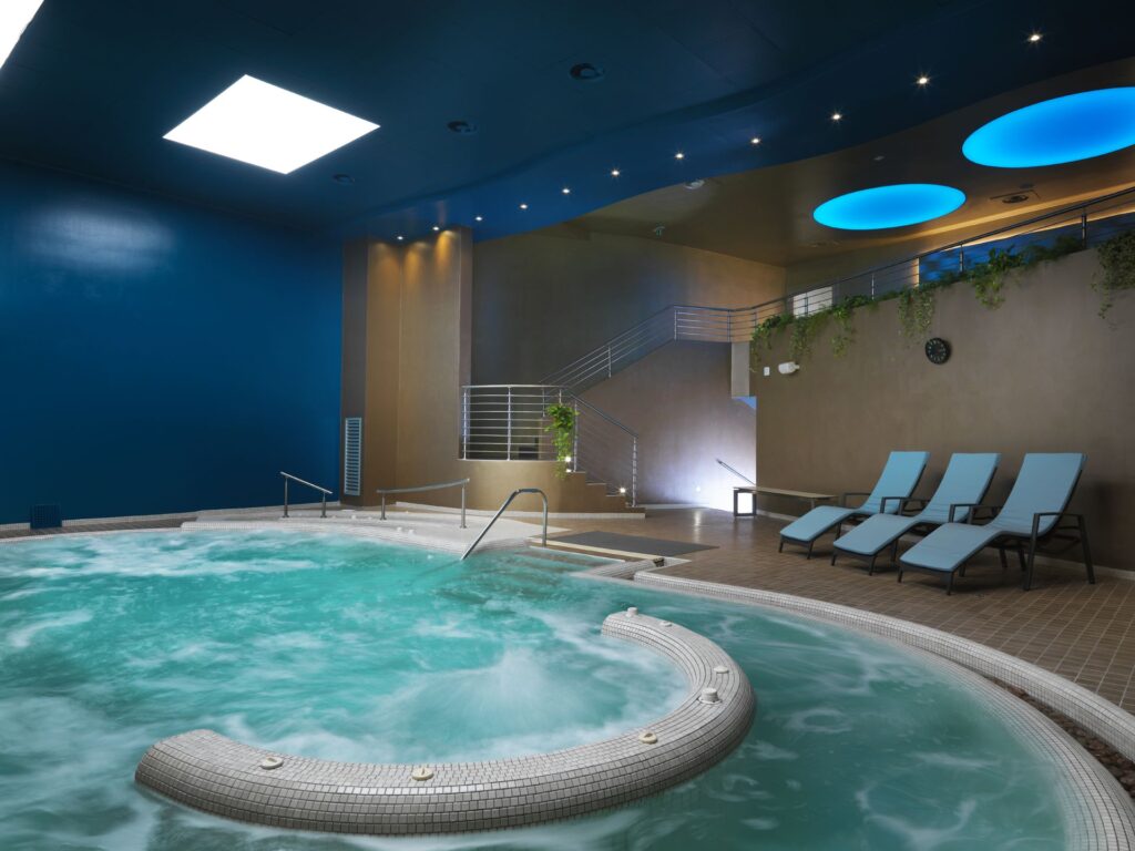 L’idea, quindi, è stata quella di posizionare un telo termoteso dell’azienda francese Barrisol e di ancorarlo al bordo del cerchio, collocando una lastra di dissipazione al centro. Nella zona relax è stata installata l’illuminazione a led sul retro dei pannelli in gesso e, per rendere omogenea la percezione luminosa, sono stati posizionati teli Barrisol anche qui, così come sopra i lettini dell’area di riposo della zona piscina, la cui vasca è illuminata da