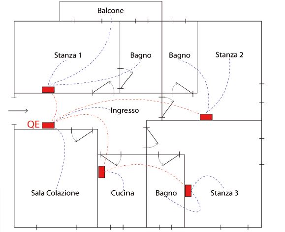 Nella planimetria si notano in rosso la localizzazione delle scatole di derivazione e i passaggi delle dorsali e del BUS (tre cavi unifilari 1,5mm standard antifiamma), mentre in blu le aree servite da ciascuna scatola.