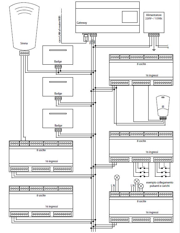L’impianto oggetto dell’articolo è un ottimo esempio di realizzazione distribuita, soprattutto per la distribuzione delle scatole di derivazione che realizzano dei mini sotto-impianti indipendenti per ciascuna stanza. I dispositivi utilizzati rendevano possibile l’installazione all’interno delle scatole grazie all’utilizzo di soli relay a ritenuta magnetica e ad un consumo fisso comunque contenuto. I 5 dispositivi 8 uscite – 16 ingressi sono stati disposti uno per ogni scatola di derivazione (tutte PT8 a meno di una PT10 sotto al QE), mentre il gateway e l’alimentatore hanno trovato posto direttamente al quadro. Lo schema mostra un esempio di collegamento della sirena e del volumetrico per quanto concerne la parte allarme ed un esempio di collegamento di pulsanti e carichi generici per tutto il resto della parte elettrica. I badge di accesso alle camere sono stati alloggiati all’interno delle scatole 503.