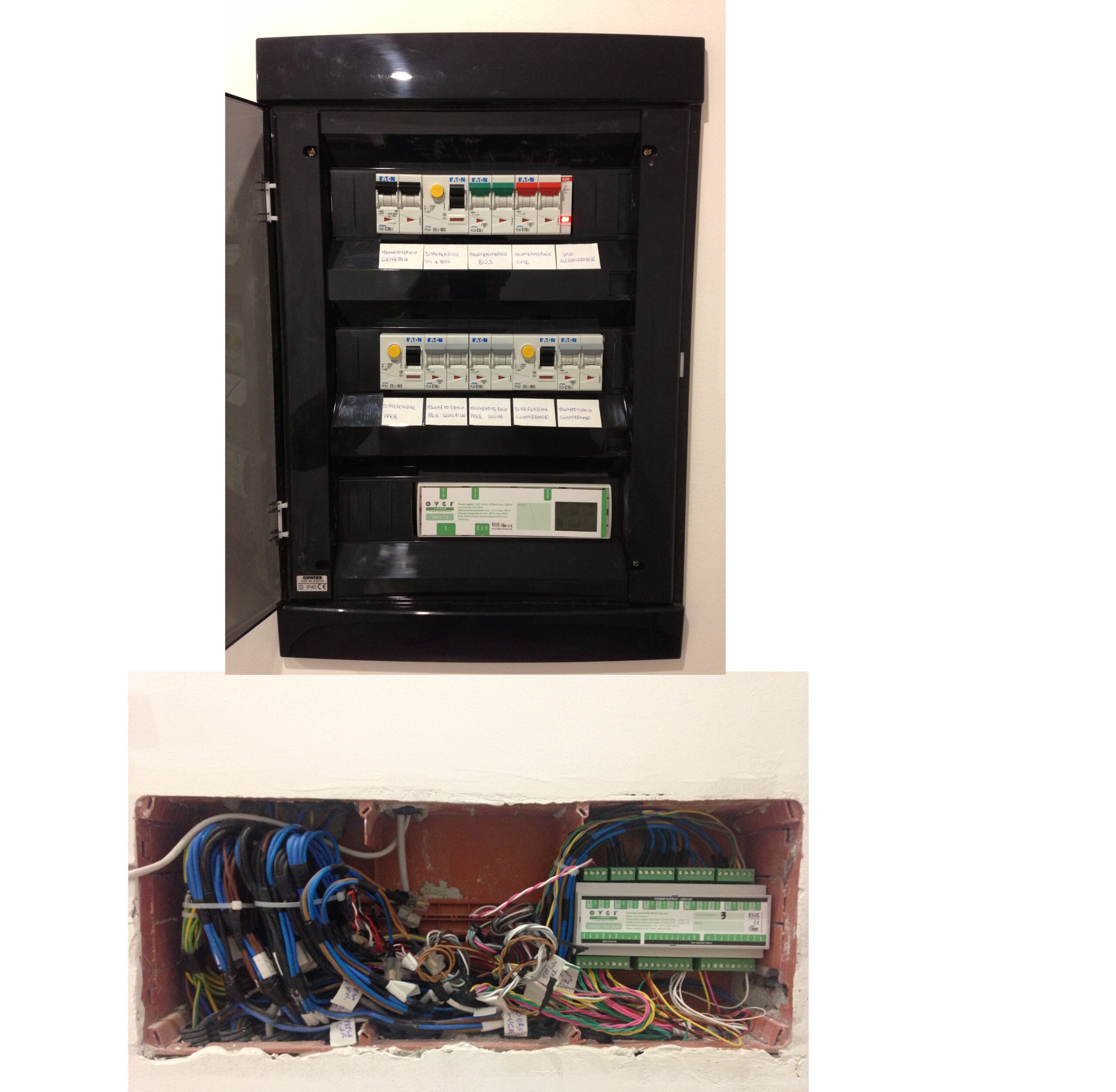 La disposizione del Gateway nel quadro elettrico e i collegamenti alla prima scatola di derivazione sotto il quadro senza setto-separatori.
