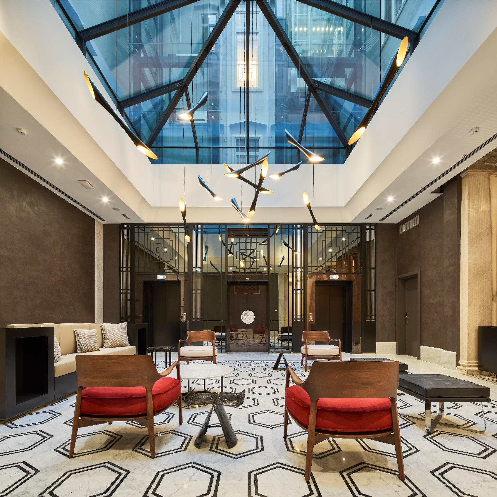 - aree comuni e di socializzazione (lounge, bar, sale riunioni, ristorante con sala colazione, ai piani inferiori; area fitness e SPA, all’ultimo piano);