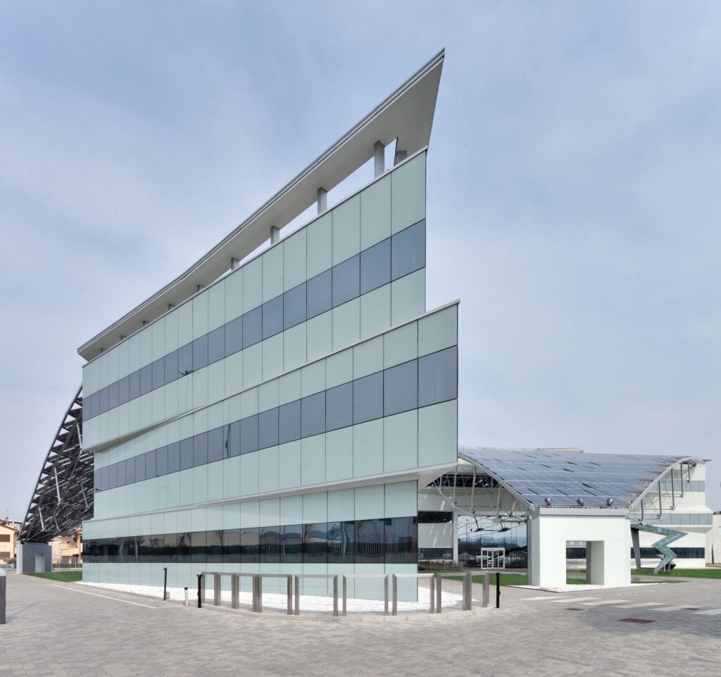 All’esterno l’impatto visivo è enfatizzato dalle due grandi vele fotovoltaiche, di forma trapezoidale, realizzate con una struttura reticolare in acciaio suddivisa in campate sulla quale sono stati installati circa 1000 pannelli fotovoltaici flessibili ad alta efficienza, che si integrano con i pannelli presenti in copertura. La vela più grande appoggiata alla facciata di ingresso ha una dimensione di 760 mq mentre quella più piccola adagiata sul prospetto posteriore misura 495 mq. La struttura metallica portante di ogni vela è costituita da un complesso sistema di centine, che sostiene un’orditura secondaria longitudinale di profili sagomati. Questi hanno la funzione di sorreggere i pannelli fotovoltaici, di alloggiare il loro cablaggio e di raccogliere le acque piovane per convogliarle in canali inclinati che scendono lungo l’estradosso delle centine. Il progetto si caratterizza per la singolarel eggerezza della struttura portante, conseguita con l’utilizzo di profili in acciaio di ridotta sezione (IPE 330), controventati e tirantati con profili tubolari. I pannelli montati sulle vele sono realizzati con una tecnologia innovativa, che affoga le cellule di silicio in un pannello di Pvc trasparente, rendendo il peso del pannello estremamente ridotto e mantenendo inalterate le caratteristiche di produzione energetica. Per aumentare la sensazione di movimento e interrompere la monotonia delle vetrate continue, le facciate prefabbricate in cemento sono state disegnate tramite elementi a modello diamante con aggetto alternato. I nastri sporgenti della facciata formano un susseguirsi di bow-window che fanno sì che i raggi solari non colpiscano direttamente gli interni dell’edificio sfruttando, a beneficio dei fruitori, il fenomeno naturale dell’effetto serra.