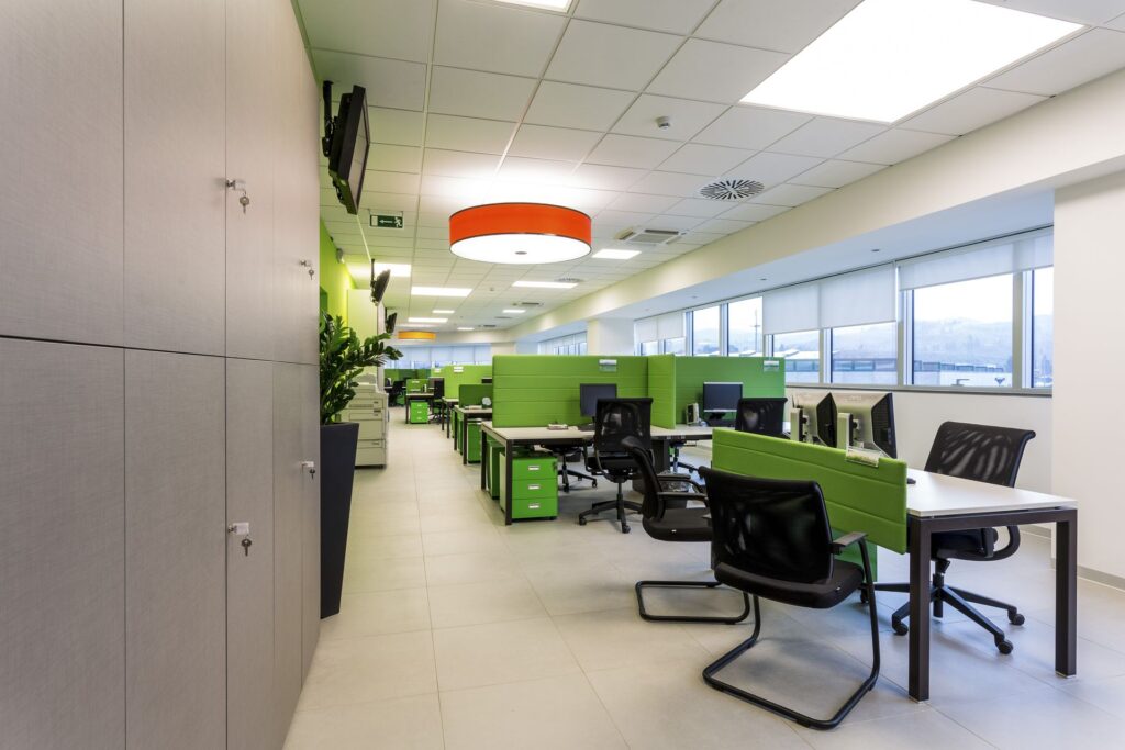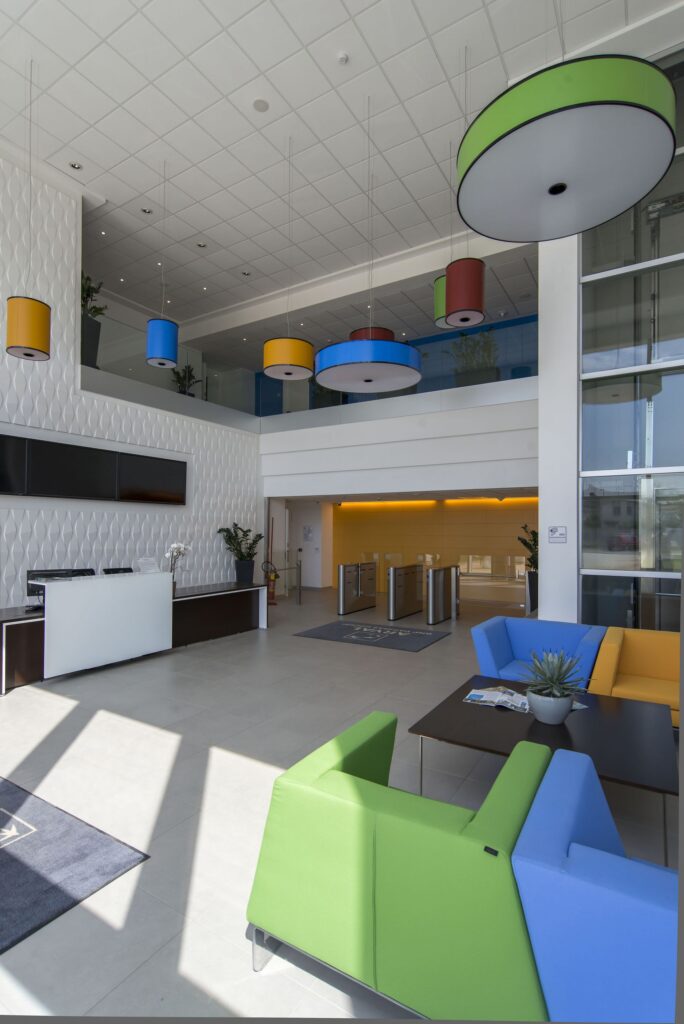 La “Saetta” è un edificio in Classe Energetica A Casa Clima privo di emissioni, energeticamente autosufficiente grazie all’impiego di impianti fotovoltaici e geotermici. Gli oltre 7000 mq di uffici e spazi comuni, distribuiti su tre piani fuori terra e uno interrato, ospitano circa 200 dipendenti per piano. Attraversando la hall centrale si accede all’edificio percependo la qualità del grande spazio a doppia altezza illuminato da una vetrata continua su due livelli. La maggior parte degli uffici si sviluppa in grandi open space dove si avverte una sensazione di spazio aperto dovuta alle vetrate interne ed esterne, nei quali controsoffitti e pannelli fonoassorbenti garantiscono il comfort acustico. Per articolare la luce artificiale sono state utilizzate plafoniere di diverse dimensioni, posizionate in maniera apparentemente casuale, che garantiscono una notevole e diffusa capacità illuminotecnica. I piani degli uffici si differenziano per il colore assegnato in base alla funzione che vi si svolge: il piano terra giallo ocra per la parte burocratica, il primo piano in blu cobalto per il dirigenti e amministrazione, il secondo piano di colore verde chiaro per call-center e formazione. Il piano interrato che ospita i locali tecnici di controllo energetico e una grande break-area è invece sui toni del marrone chiaro.