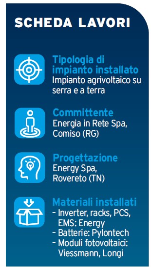 Uno dei primi esempi in Italia si trova nel territorio di Comiso (Ragusa), dove sono stati recen­temente completati due progetti in scala industriale (agrivoltaico su serra, più fotovoltaico a ter­ra tradizionale) per una potenza complessiva di 1.000 kW, abbina­ti a 1.200 kWh totali di capacità d’accumulo.