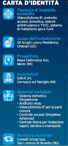 I numeri del nuovo complesso “Gli Scogli”, luxury residence fronte mare sorto sul vecchio “Cantiere Navale di Chiavari”, chiuso negli anni 70 e tornato a splendere grazie a un concept innovativo, sono: 6 edifici per 12 unità commerciali e 60 appartamenti esclusivi. Per garantire tranquillità e privacy ai residenti del complesso, la committenza ha preso la decisione di installare più soluzioni domotiche e impianti per la gestione del comfort abitativo e della sicurezza, tecnologie integrate a 360° che hanno coinvolto, nello specifico, tutti i sistemi offerti da Comelit.