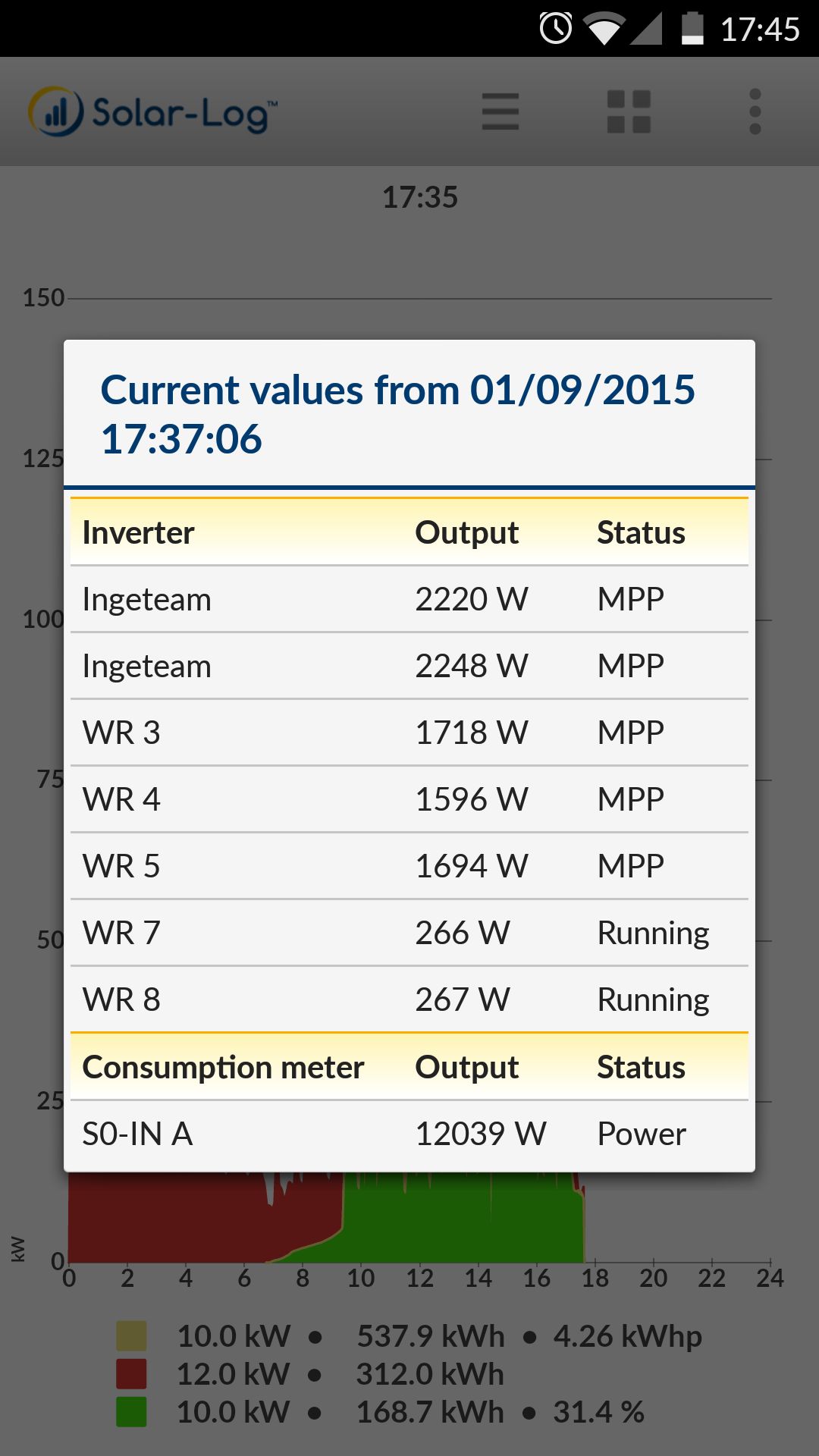 Visualizzazione su smartphone: output istantaneo dei singoli inverter e valore totale.