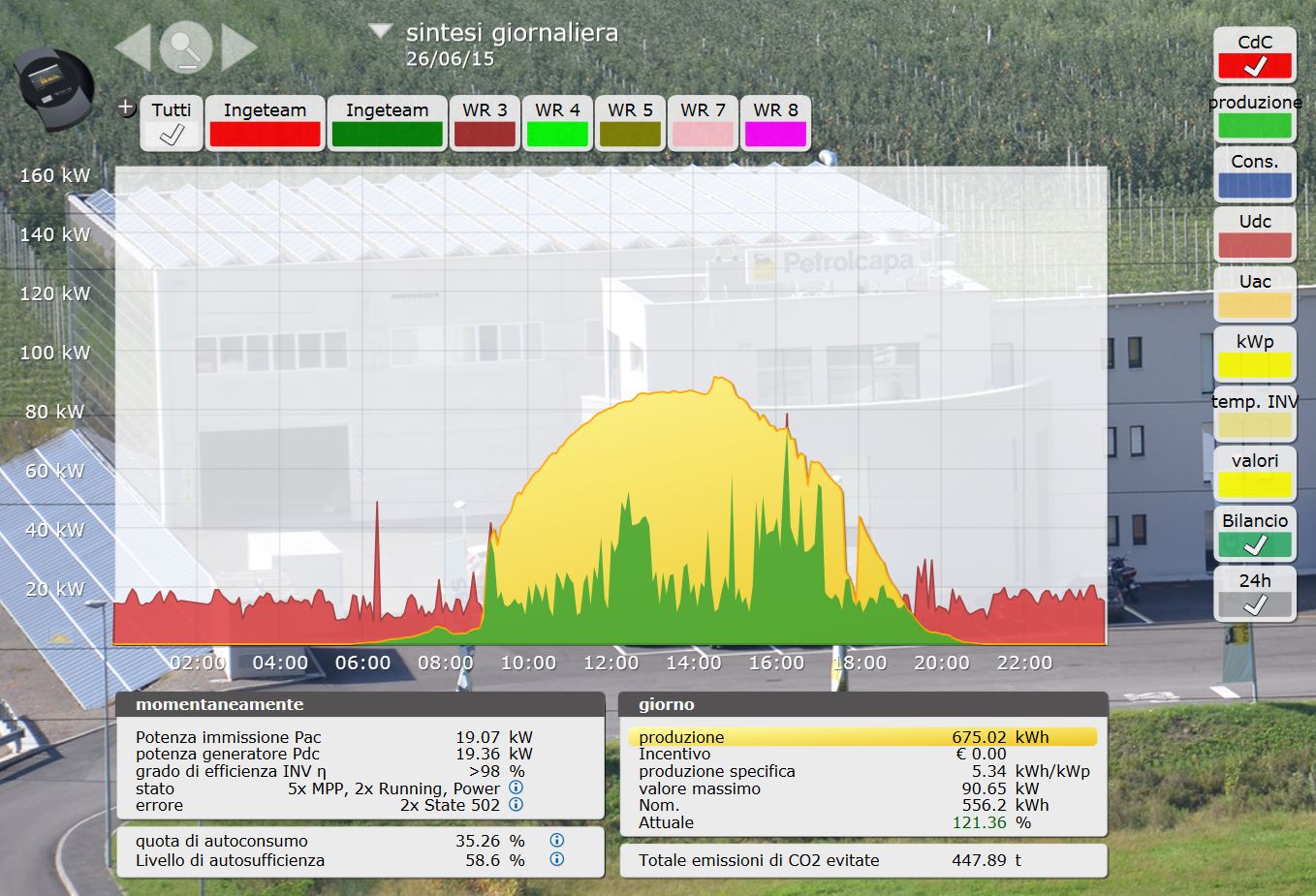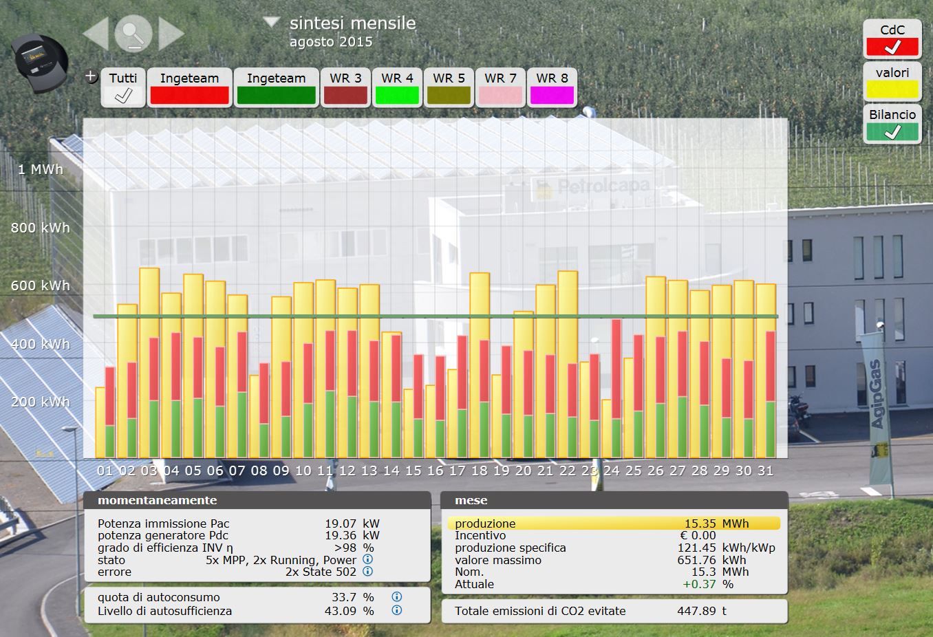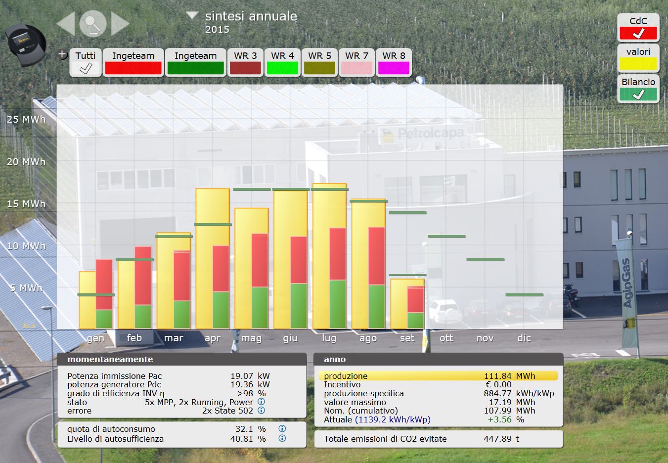 Solar-Log 2000 monitora anche il consumo complessivo dello stabilimento, indipendentemente se l’energia elettrica proviene dalla rete o dall’impianto fotovoltaico. Un ulteriore ingresso del Solar-Log 2000 è usato proprio per monitorare i consumi. Questa è un’informazione utile per capire in che momenti della giornata il consumo è più elevato e per cercare di migliorare l’efficienza dello stabilimento. «Monitoriamo sempre di più i consumi complessivi nelle realizzazioni di cui ci occupiamo: il primo passo per fare efficienza è capire la situazione allo stato attuale. In questo caso non c’è una grossa differenza di consumo tra giorno e notte perché si tratta di un’azienda che distribuisce gas e i sistemi di controllo e di illuminazione devono quindi rimanere attivi anche di notte. Misuriamo però dei picchi di consumo (anche di 100 kW a livello di potenza assorbita) per una durata di un 15/20 minuti quando vengono attivati i sistemi di pompaggio che trasferiscono il gas nei serbatoi dei camion. Il fatto di sapere che il consumo notturno è quasi uguale a quello diurno potrebbe spingere il cliente a realizzare interventi di efficienza energetica sull’illuminazione, installando sistemi a LED. Grazie al monitoraggio abbiamo anche appurato che l’impianto in facciata produce meno in estate rispetto a primavera e autunno. Si tratta di una grossa differenza rispetto agli altri sotto-impianti».