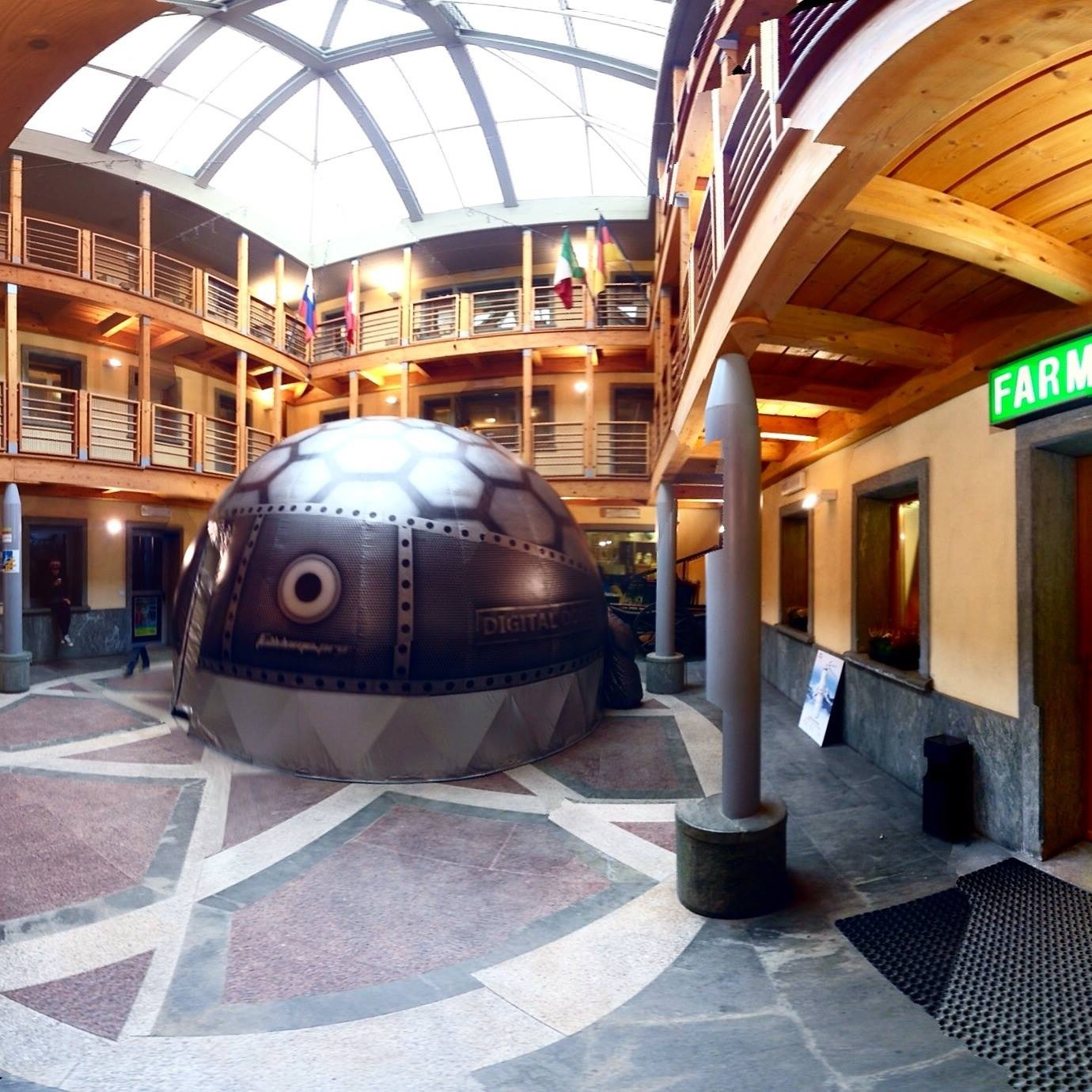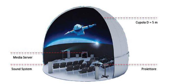 La tecnologia innovativa a più punti di proiezione, fino a questo momento impiegata soltanto nei planetari stazionari, permette al pubblico di fruire di filmati con un effetto 3D senza la necessità di indossare gli appositi occhiali. Ma quali sono i componenti utilizzati per realizzare il sistema DigitalDome della cupola itinerante? Da una parte la cupola stessa, composta dalla carcassa geodetica in alluminio, attraverso un sistema a incastro, e tre strati di tela ignifuga, dall’altra il media server per la gestione dei contenuti, i due proiettori, il sistema surround di tipo 5.1 e il gruppo di continuità.