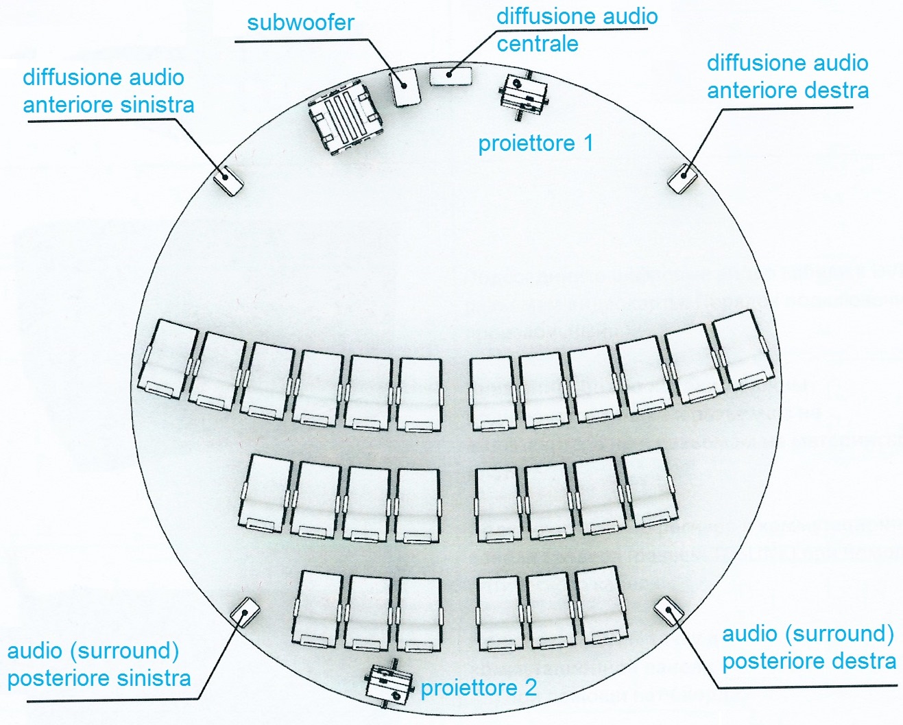 La proiezione, realizzata con 2 proiettori ViewSonic racchiusi in due box separati di protezione e che operano con un flusso luminoso di 7000 lumen, è supportata da un sistema surround di tipo 5.1 con 5 diffusori e 1 subwoofer, in grado di garantire una diffusione del suono uniforme all’interno della cupola e in tutta la scala di tonalità, da quelle più alte fino ad arrivare alle più basse.