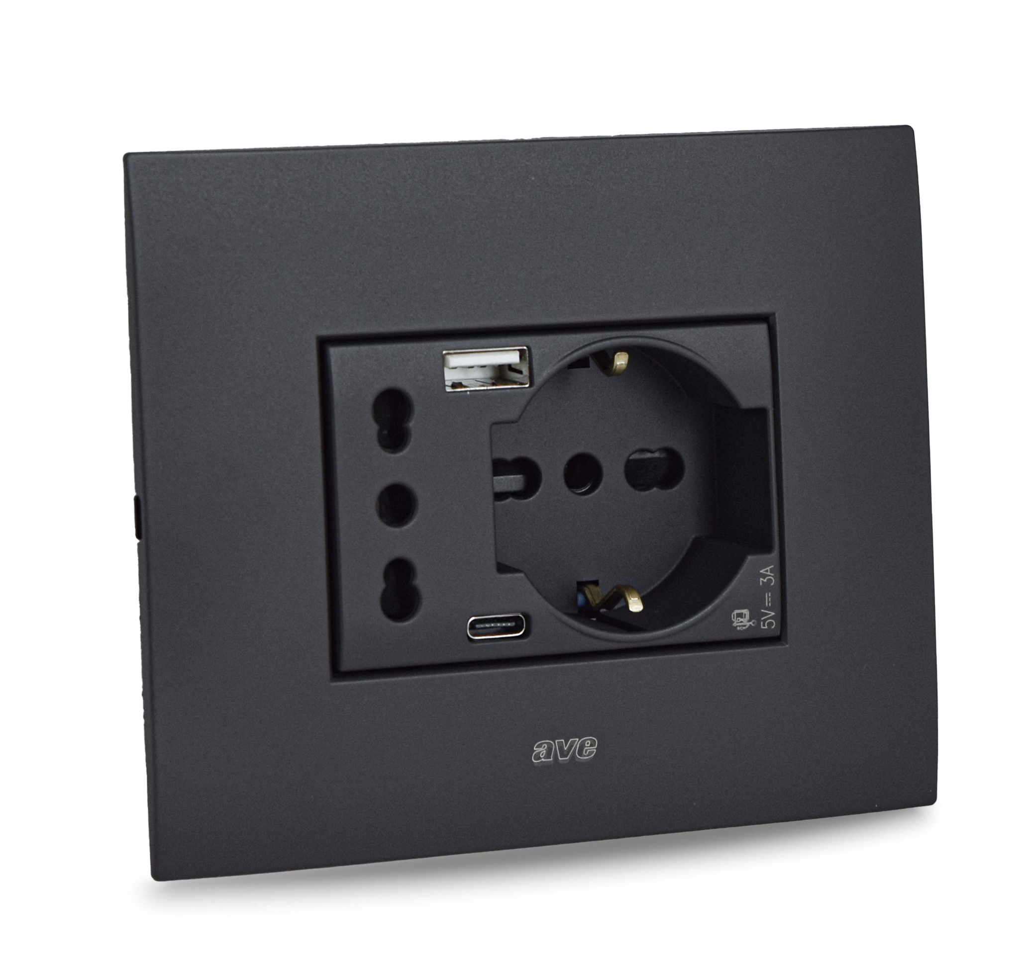 Una soluzione innovativa ave integra in soli 3 moduli fino a 4 tipologie di prese alimentate con singolo cablaggio: una bipasso, una schuko universale e due USB (tipo A e tipo C).