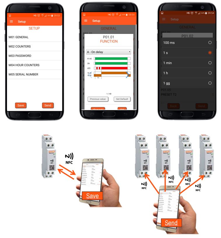 Scegliendo un temporizzatore NFC, il loro setup diventa semplice, senza limiti e a prova di errore. È infatti possibile settare i parametri direttamente dal proprio smartphone o tablet Android, senza la necessità di alimentare il temporizzatore e di consultare il manuale. La configurazione effettuata sarà trasmessa al temporizzatore semplicemente avvicinandogli lo smartphone. L’attuale stato di avanzamento della tecnologia consente di impostare tramite interfacce grafiche chiare e intuitive sia le funzioni più comuni e utilizzate, come anche quelle più ricercate: ritardo all’eccitazione, ritardo alla diseccitazione, intermittenza (pausa-lavoro), generatore d’impulso, relè passo-passo, salvaguardia, eccitazione temporizzata all’apertura o chiusura di un contatto, filtro analogico, conta pezzi, contaore e tante altre.