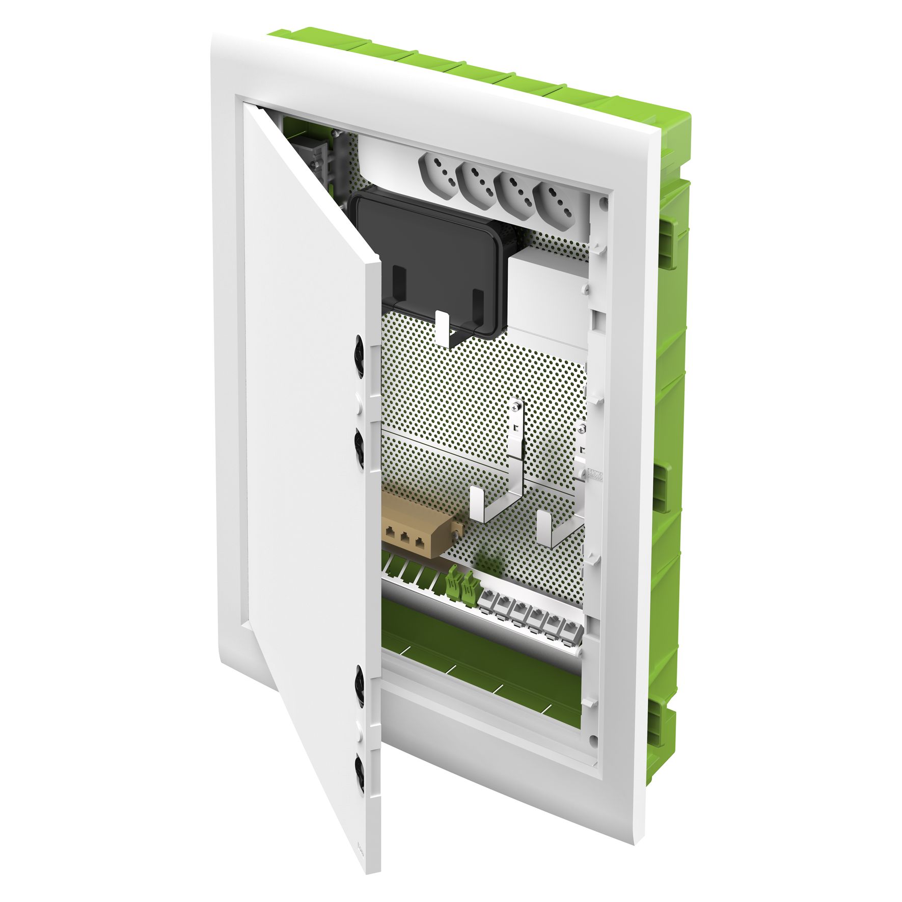 Quadro Distribuzione Segnali di Appartamento (QDSA). Quadro da incasso che raccoglie e smista i servizi e i segnali ottici destinati all’appartamento, ospitando i componenti passivi (STOA, miscelatori, filtri) e gli apparati attivi (modem, switch, amplificatori di segnali) dell’impianto domestico