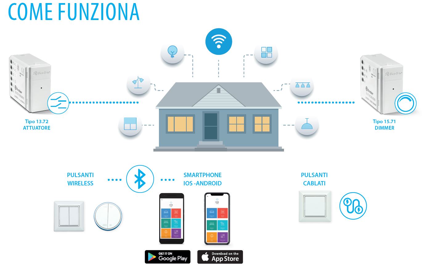 Accendere/spegnere/regolare l’intensità della luce; creare scenari; comandare tapparelle elettriche da smartphone o con pulsante wireless