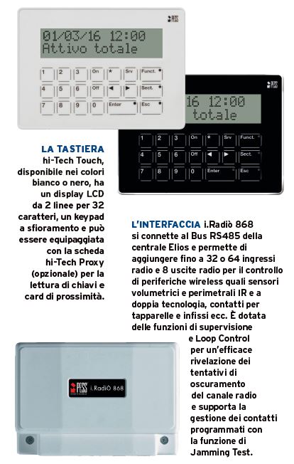 Grazie al modulo di interfaccia radio i-Radiò 868, installabile anch’esso su bus RS485, è possibile aggiungere fino a 32 o 64 ingressi radio e 8 uscite radio per il controllo delle periferiche wireless quali sensori volumetrici e perimetrali IR e a doppia tecnologia, contatti per tapparelle e infissi ecc.