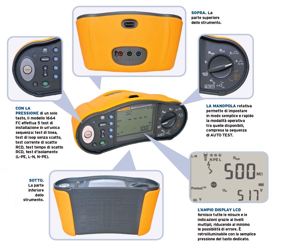 Il Fluke 1664FC è un tester multifunzione che, al pari degli altri modelli della Serie 1660, permette di verificare in modo rapido ed efficace qualsiasi impianto elettrico secondo le normative locali, garantendo sia la protezione delle apparecchiature collegate sia la sicurezza del tecnico che effettua i test. Gli ingegneri americani hanno voluto concepire un prodotto innovativo, affidabile e semplice da utilizzare introducendo una serie di funzionalità inedite che velocizzano le operazioni di test grazie a sequenze automatiche predefinite, minimizzano le possibilità di errori, rilevano eventuali apparecchiature collegate al fine di proteggerle e condividono i risultati in modalità wireless per il lavoro in team.
