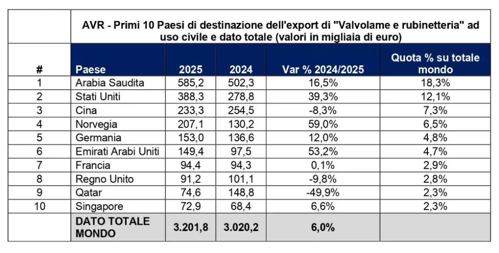 Il settore italiano delle valvole e rubinetteria si conferma un’eccellenza a livello internazionale. Secondo i dati dell’Ufficio Statistica di Anima Confindustria divulgati da Avr -Associazione italiana costruttori valvole e rubinetteria federata ad Anima, – durante MCE–Mostra Convegno Expocomfort, nel 2025 il valore dell’export del comparto valvole e rubinetteria (comprende valvole per building, valvole industriali, rubinetteria sanitaria e raccordi) ha raggiunto quasi 6,2 miliardi di euro, in crescita del 5,2% sul 2024, con una stima di fatturato totale di 9,55 miliardi di euro. Per quanto riguarda le sole valvole e rubinetteria a uso civile, il valore dell’export ha superato i 3,2 mld di euro (+6% sul 2024).