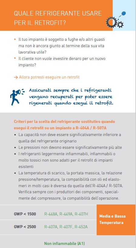 Il volantino esorta gli installatori a smettere di utilizzare R-404A e R-507A nelle nuove apparecchiature, a riconvertire le installazioni che funzionano con questi due gas, a ridurre le fughe e i carichi di fluidi refrigeranti e a recuperare i fluidi.