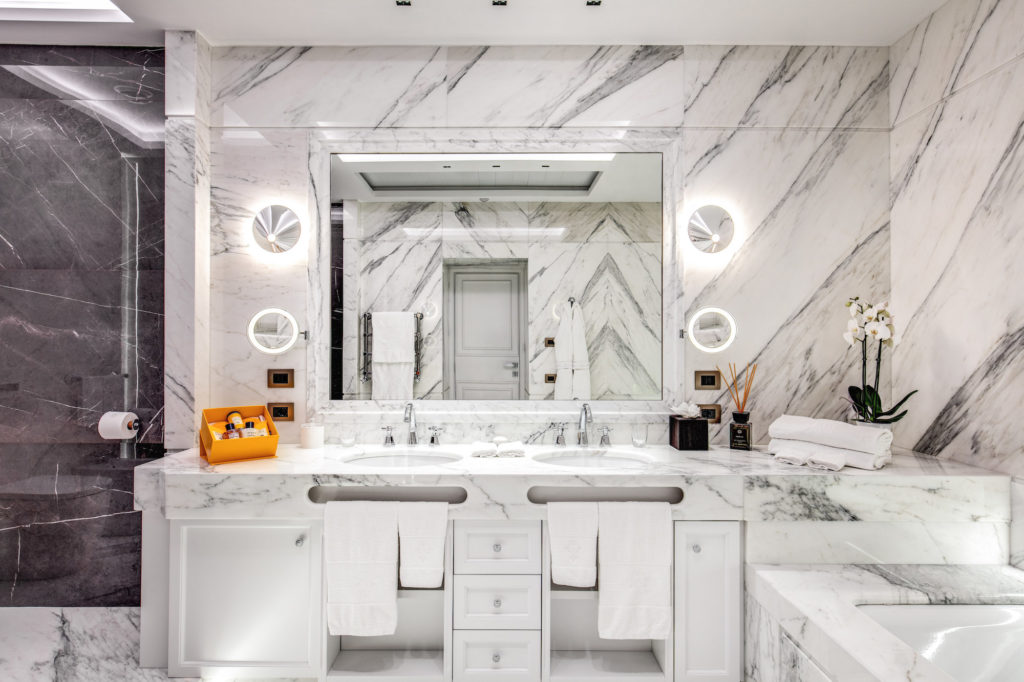 Per rispettare il contesto sofisticato, volto a impreziosire il soggiorno della clientela più esigente, gli ampi e luminosi spazi delle camere sono adornati con i marmi italiani più prestigiosi, rifiniti con signorili boiserie e completati con la collezione Eccelsa di Rubinetterie Stella in finitura cromo come naturale corredo delle lussuose sale da bagno.