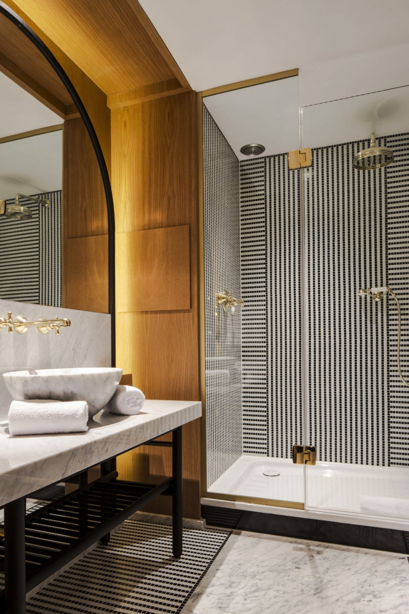 Sala da bagno dell’Hotel Vernet allestita con la collezione Roma