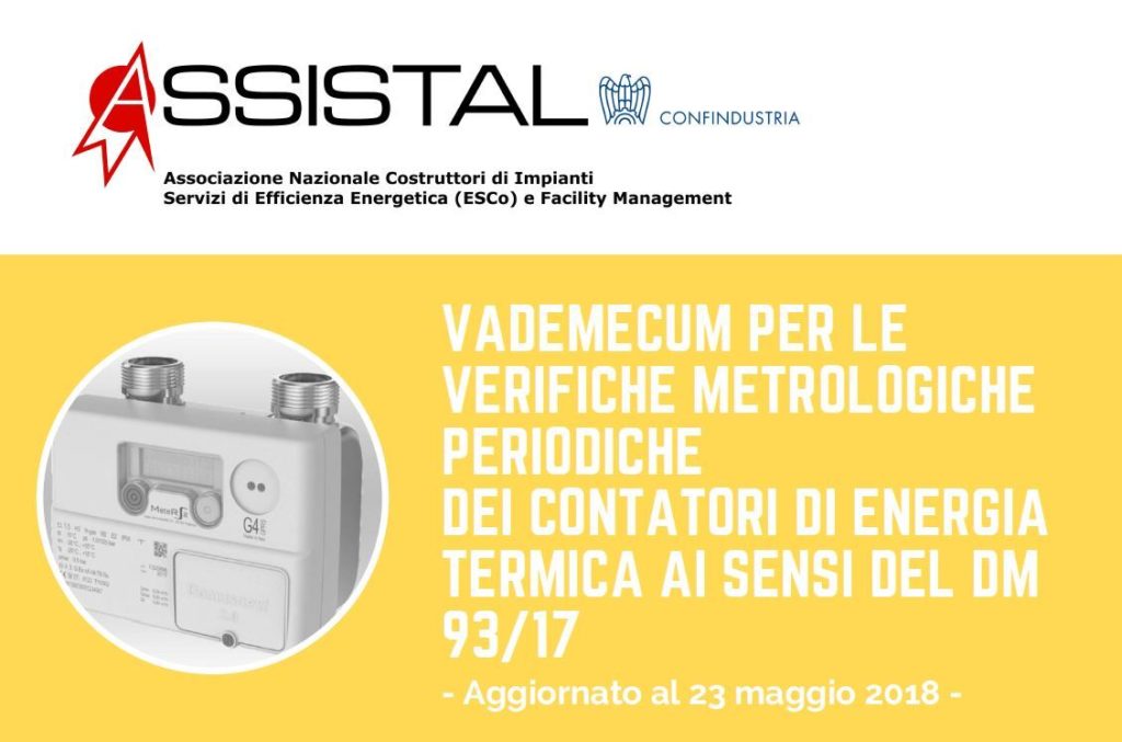 In data 23 maggio Assistal ha aggiornato il suo Vademecum per le verifiche metrologiche periodiche dei contatori di energia termica ai sensi del Decreto 21 aprile 2017 n. 93, entrato in vigore il 18 settembre 2017. Il decreto definisce la nuova disciplina attuativa della normativa sui controlli e sulla vigilanza degli strumenti di misura in servizio, tra cui i contatori di energia termica.