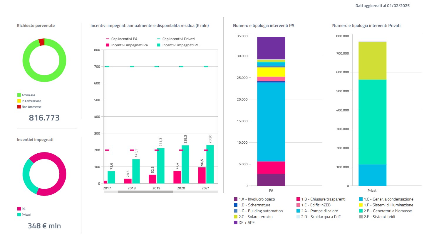 Per l’anno 2025, sulla base delle informazioni del Contatore del Conto Termico disponibili al 1° febbraio, il contatore stima un impegno di spesa complessivo pari a 348 milioni di euro, di cui 109 milioni per interventi di privati e 239 milioni per interventi della Pubblica Amministrazione (dei quali 50 milioni mediante prenotazione).