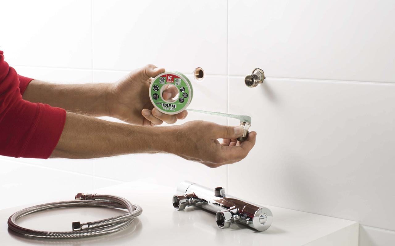 KOLMAT® FIBRE SEAL: Per sigillare i raccordi del lavabo. Nastro sigillante universale rinforzato con fibre per connessioni coniche e cilindriche in metallo e plastica. Adatto per acqua (potabile), gas, GPL (gas), aria (compressa), acidi e basi diluiti.