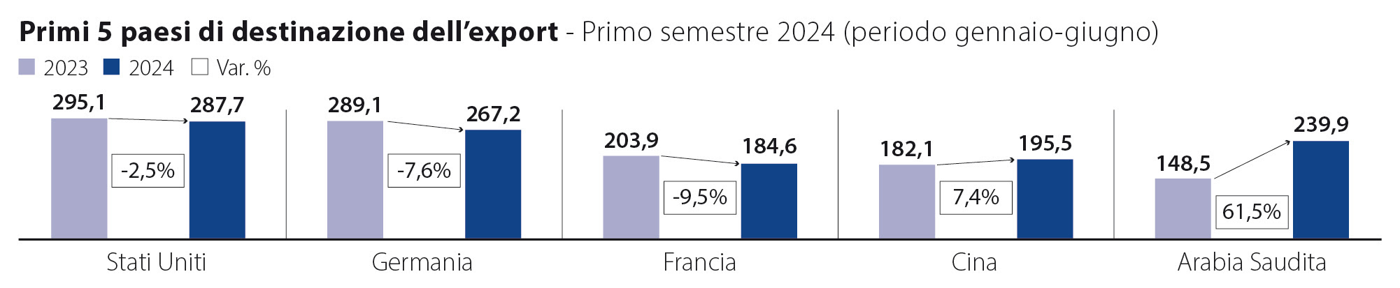 In cima alla classifica dei principali paesi di destinazione delle esportazioni si confermano gli Stati Uniti, seguiti da Germania e Francia. Tuttavia, si registra un lieve calo delle spedizioni verso questi mercati rispetto allo stesso periodo dello scorso anno, riflettendo le dinamiche economiche e commerciali globali. A trainare la crescita complessiva del settore è invece il notevole incremento delle esportazioni verso l’Arabia Saudita, che ha registrato una crescita del +61,5%. Questo aumento testimonia la crescente domanda di prodotti italiani di alta qualità in nuovi mercati strategici, confermando la vocazione internazionale del settore.