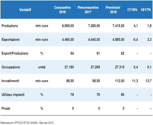 Il settore specifico ha concluso l’anno 2017 con un incremento del valore della produzione (+4,1%), trend positivo che si prevede prosegua anche nel 2018 (+1,8%). Le esportazioni, che nel 2017 sono diminuite rispetto all’anno precedente (-0,4%), si crede possano crescere nell’anno in corso (+3,3%).
