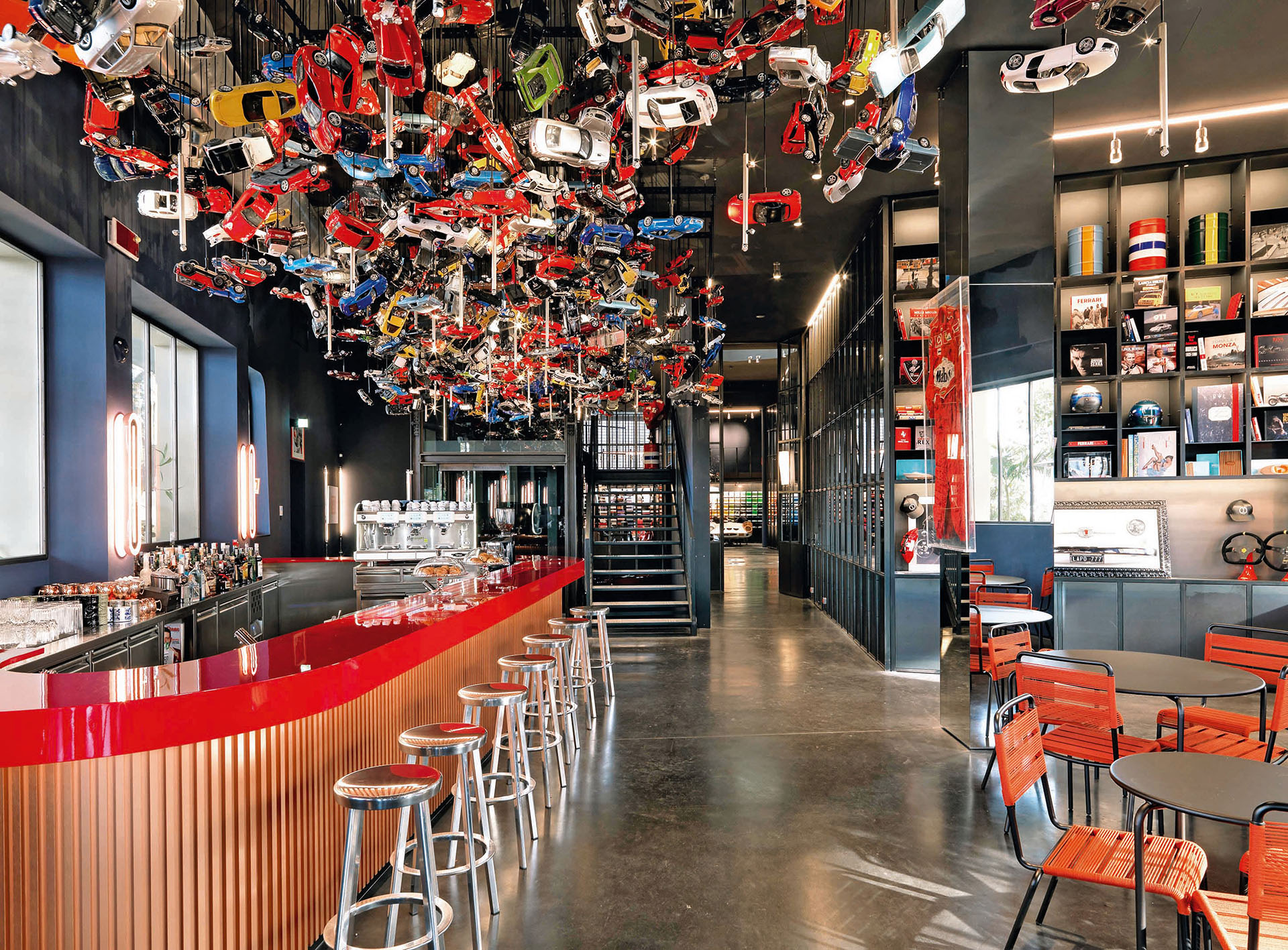 L’interno è stato completamente ripensato per ospitare un’officina dedicata ai motori e un ristorante. Al piano terra si trovano gli uffici e lo showroom per la creazioni di modelli customizzati di automobili il piano superiore ospita invece il ristorante arredato con grafiche racing, lampade a forma di marmitta di automobili, poltrone che ricordano i sedili da corsa e sullo sfondo la scocca di una Ferrari 250 GTO.