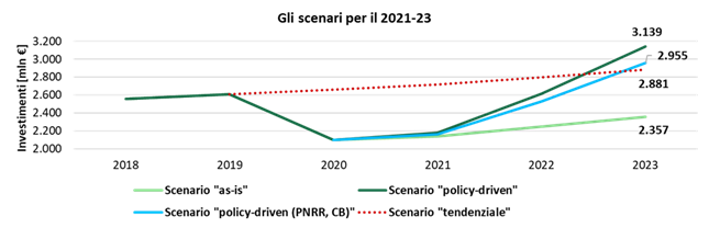 Al contrario, in assenza di questi strumenti di stimolo lo scenario attuale “as is” avrebbe portato a una crescita lieve degli investimenti nel 2021 (+2% sul 2020), in linea con il 2018-2019, e a una più sostenuta nel 2022-2023, comunque limitata al 5% anno su anno, superando i 2,3 miliardi nel 2023 (il 90% di quelli nel 2019), mentre senza il Covid lo scenario “tendenziale” avrebbe portato gli investimenti a circa 2,9 miliardi.