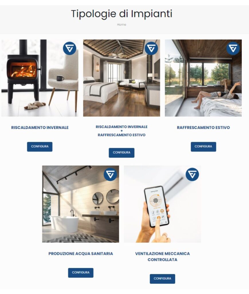 La presenza del configuratore di impianti permette in maniera semplice e veloce di identificare l’impianto ideale per ogni esigenza. Questo offre vantaggi sia al cliente inesperto, che troverà agevolmente la tipologia idonea alla sua abitazione, sia all’impiantista, che  riceverà via mail una richiesta di contatto per analizzare e preventivare l’impianto già identificato.