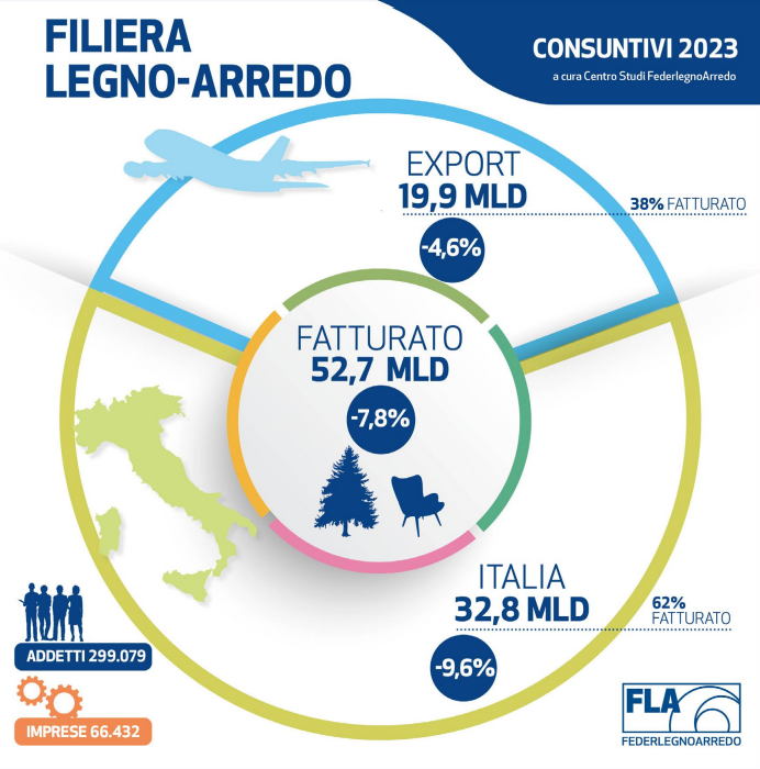 Diffusi da FederlegnoArredo i numeri dei consuntivi che fotografano l’anno 2023 della filiera legno-arredo.