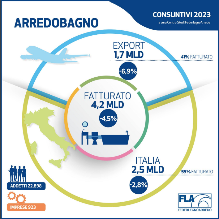 Dopo un biennio di forte dinamismo, grazie all’andamento straordinario del settore residenziale, come attestano i dati consuntivi del Centro Studi FederlegnoArredo, nel 2023 il sistema arredo bagno subisce una contrazione del 4,5%. Il settore si mantiene tuttavia sui 4,2 miliardi di euro di fatturato: sopra i 3,4 del pre covid.