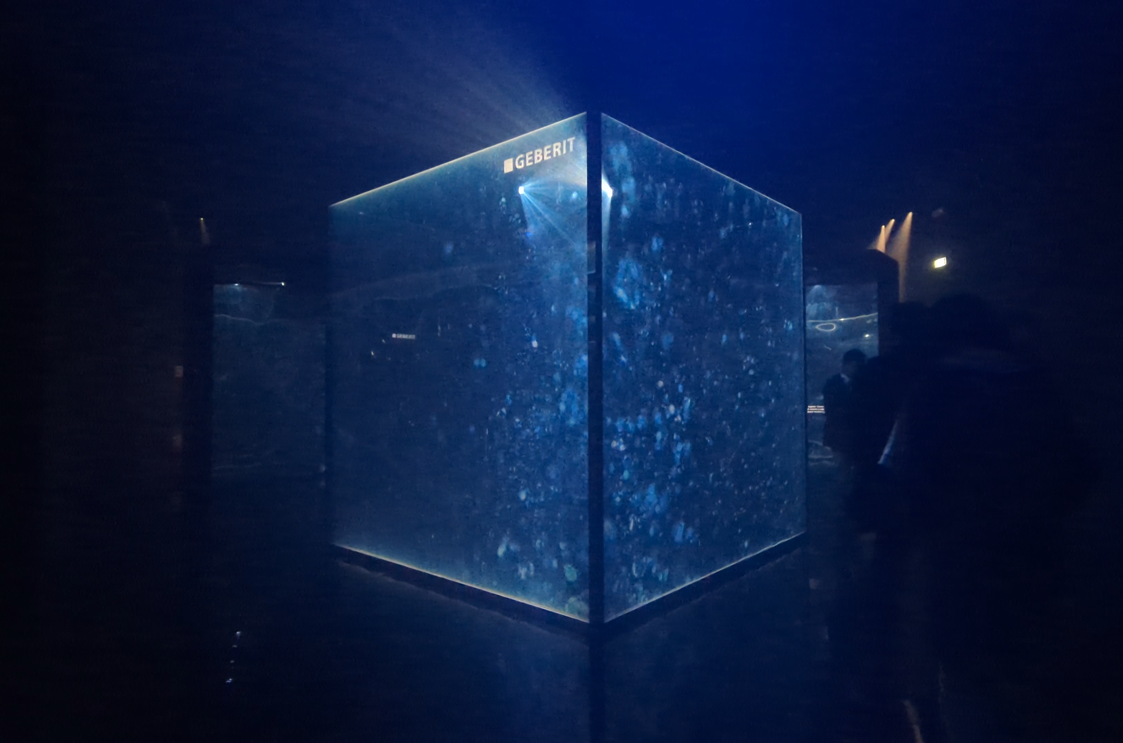 Nella seconda area, viene invece esplicitato il concetto “Mastering Water”, essenzialità del know-how e della tecnologia Geberit. Protagonista è un cubo trasparente al centro dell’installazione che simula i movimenti dell’acqua, incarnando l’essenza dei prodotti Geberit. Grazie all’uso di tecnologie avanzate, l’acqua diventa una risorsa controllabile, ottimizzata e al servizio del comfort quotidiano, portando concreti vantaggi in termini di qualità della vita. Innovazione, funzionalità estetica e rispetto per l’ambiente si sublimano nelle soluzioni d’avanguardia per il bagno Geberit.
