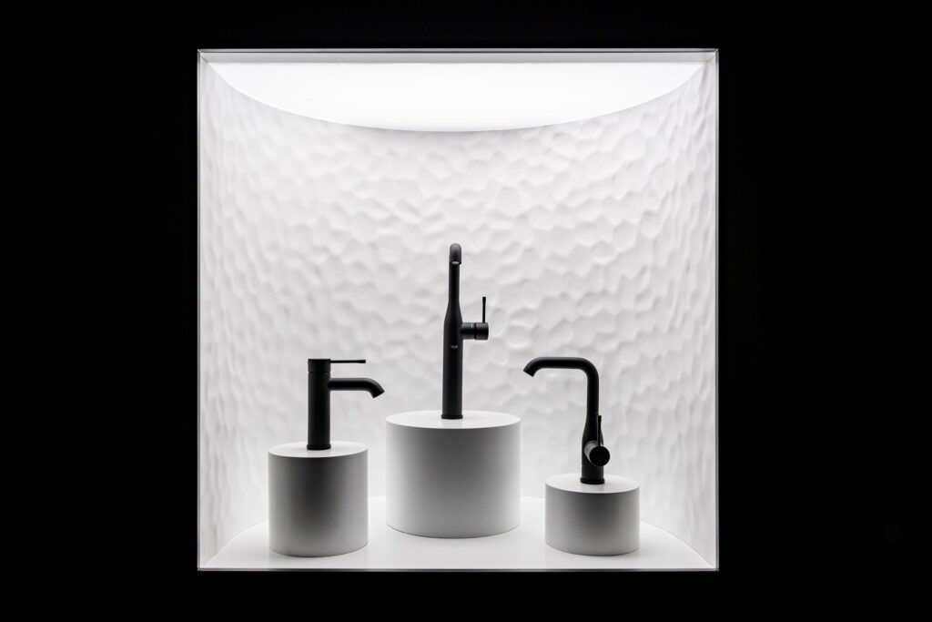 All’interno di spazi finemente curati, Grohe Aqua Gallery espone i prodotti sia come elementi funzionali (Funzione) che sofisticate opere artigianali (Forma) offrendo esperienze significative di interazione con l’acqua (Impatto), che esplorano il legame tra uomo, acqua e ambiente, in un equilibrio tra design e innovazione.