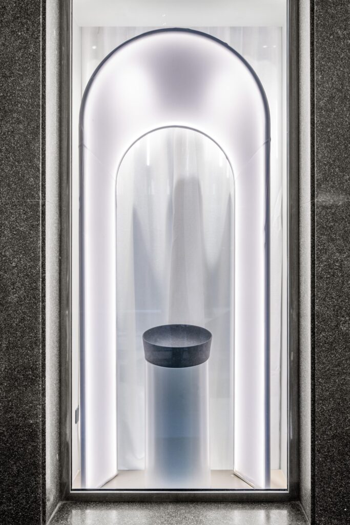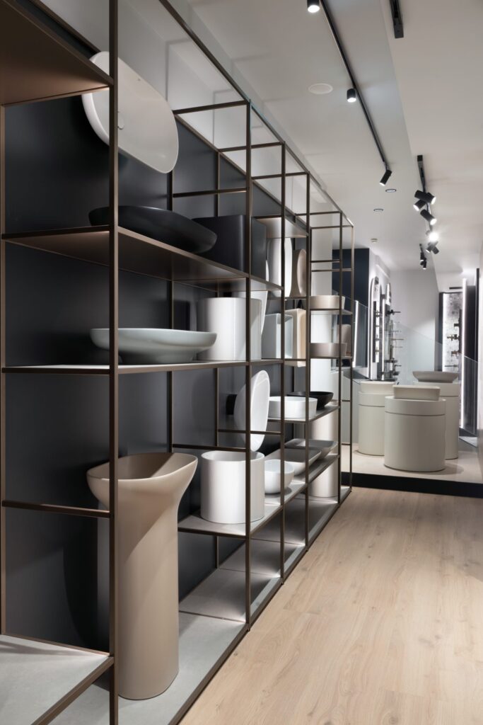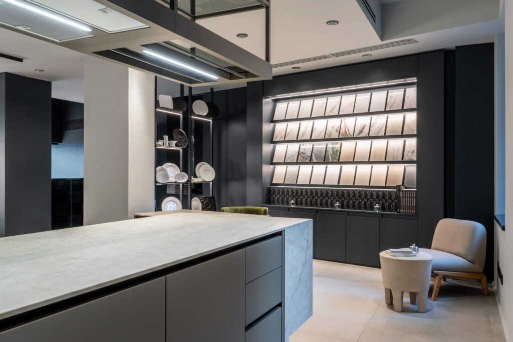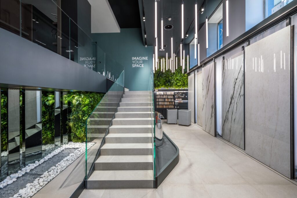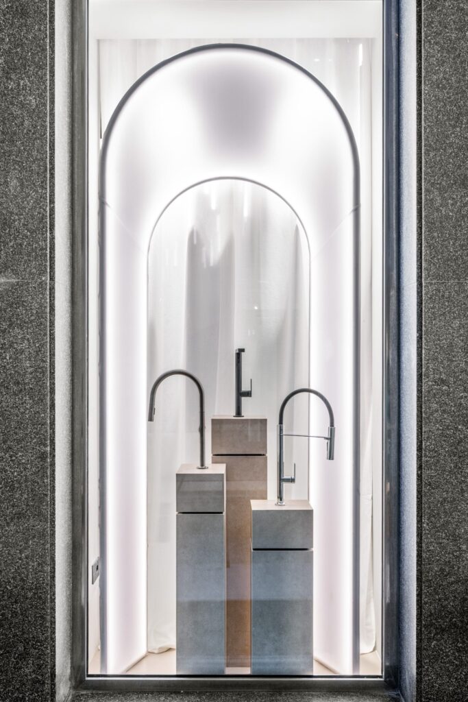 L’effetto teatrale delle vetrine è sottolineato da archi retroilluminati che incorniciano i prodotti di punta, mentre le lastre Maximus di grandi dimensioni scorrono su un sistema di binari creando delle quinte dinamiche che introducono alla parete-materioteca dov’è presentata un’ampia selezione delle finiture disponibili. Un lampadario chandelier composto da 86 punti luce disposti in modo calibrato per formare un’onda luminosa così come l’installazione di docce Kludi-Asana collegano il piano terra al mezzanino.