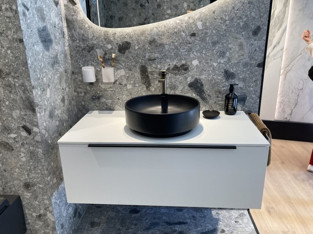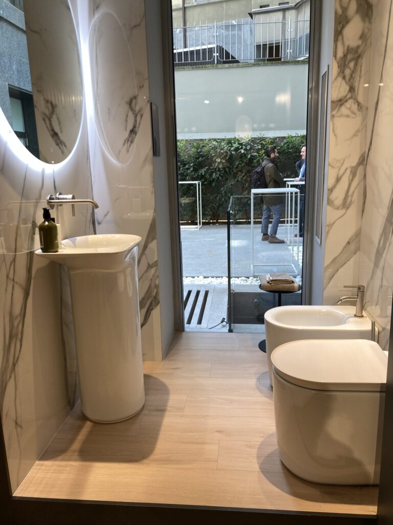Il percorso prosegue al basement che si configura come un’area espositiva dedicata, in cui ogni ambiente è studiato per mettere in evidenza la qualità dei prodotti, l’ampiezza di gamma e il concetto di soluzione completa. Tra le collezioni esposte, la linea RAK-Valet del designer francese Patrick Norguet, con forme monolitiche dai bordi inaspettatamente sottili; RAK-Des, omaggio alla scuola Bauhaus; RAK-Batu, una collezione materica in mica, presentata anche nella versione freestanding. A completamento la collaborazione con Elie Saab per una proposta superfici, arredo-bagno e wellness di alta gamma.