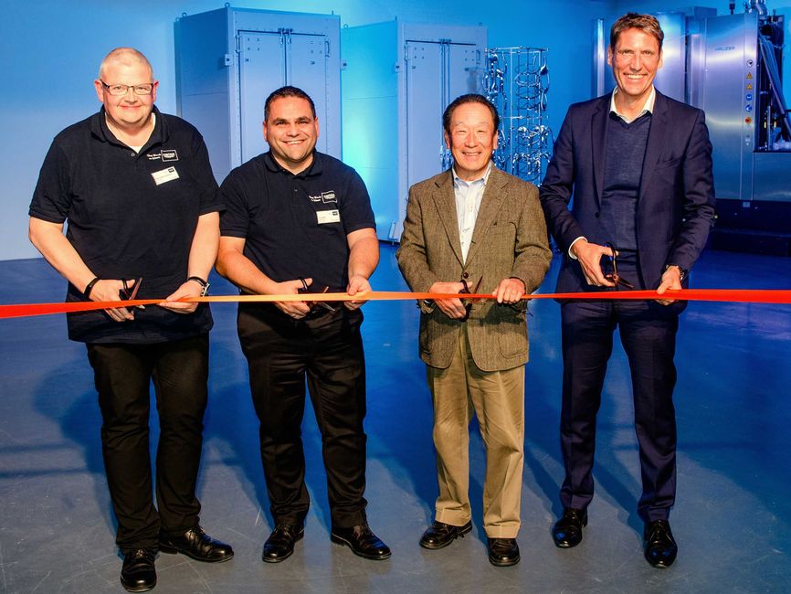 Il nastro simbolico davanti ai nuovi macchinari è stato tagliato da Thomas Fuhr, COO Fittings LIXIL International e CEO di Grohe AG, Ryuichi Kawamoto, Director di LIXIL Group Corporation, Hans-Martin Souchon, Plant Manager di Grohe AG Lahr e Timo Mai, Works Council Chairman di Grohe AG a Lahr.