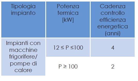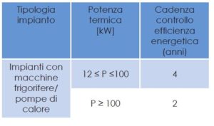 L’obbligo di controllo di efficienza energetica ricade sugli impianti per climatizzazione estiva e pompe di calore di potenza termica utile nominale pari o superiore a 12 kW. La potenza dell’impianto si calcola come la somma delle potenze utili delle macchine frigorifere che agiscono sullo stesso sistema di distribuzione. L’obbligo di trasmissione del rapporto di efficienza energetica da parte dell’installatore o del manutentore ha le scadenze temporali definite in tabella.
