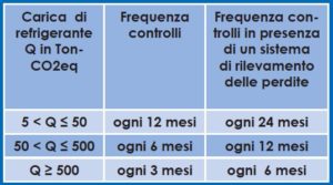 Dal 2015 è in vigore il nuovo Regolamento europeo sui gas fluorurati a effetto serra (F-gas) n. 517/2014 che stabilisce l’obbligo di far eseguire controlli periodici di verifica delle perdite di gas refrigerante e la tenuta del registro per le apparecchiature fisse di climatizzazione estiva e delle pompe di calore contenenti quantitativi di gas refrigerante a effetto serra (HFC – carica di refrigerante) pari o superiori a 5 tonnellate di CO2 equivalente o 10 tonnellate di CO2 equivalente se ermeticamente sigilliate.
