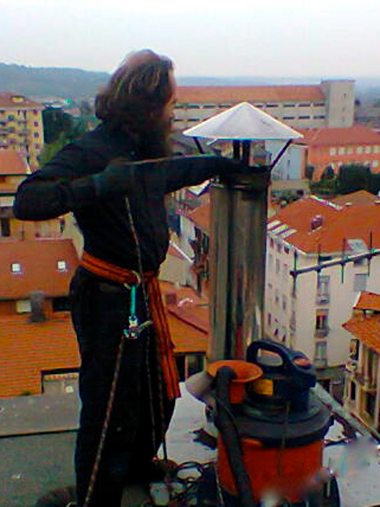 INTERVENTO DAL TETTO. La scelta degli strumenti da utilizzare dipende dal tipo di canna fumaria e di fuliggine: in questo caso la pulizia viene effettuata con una corda dotata, all'estremo, di un utensile specifico