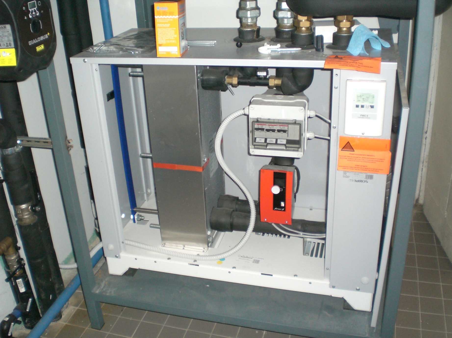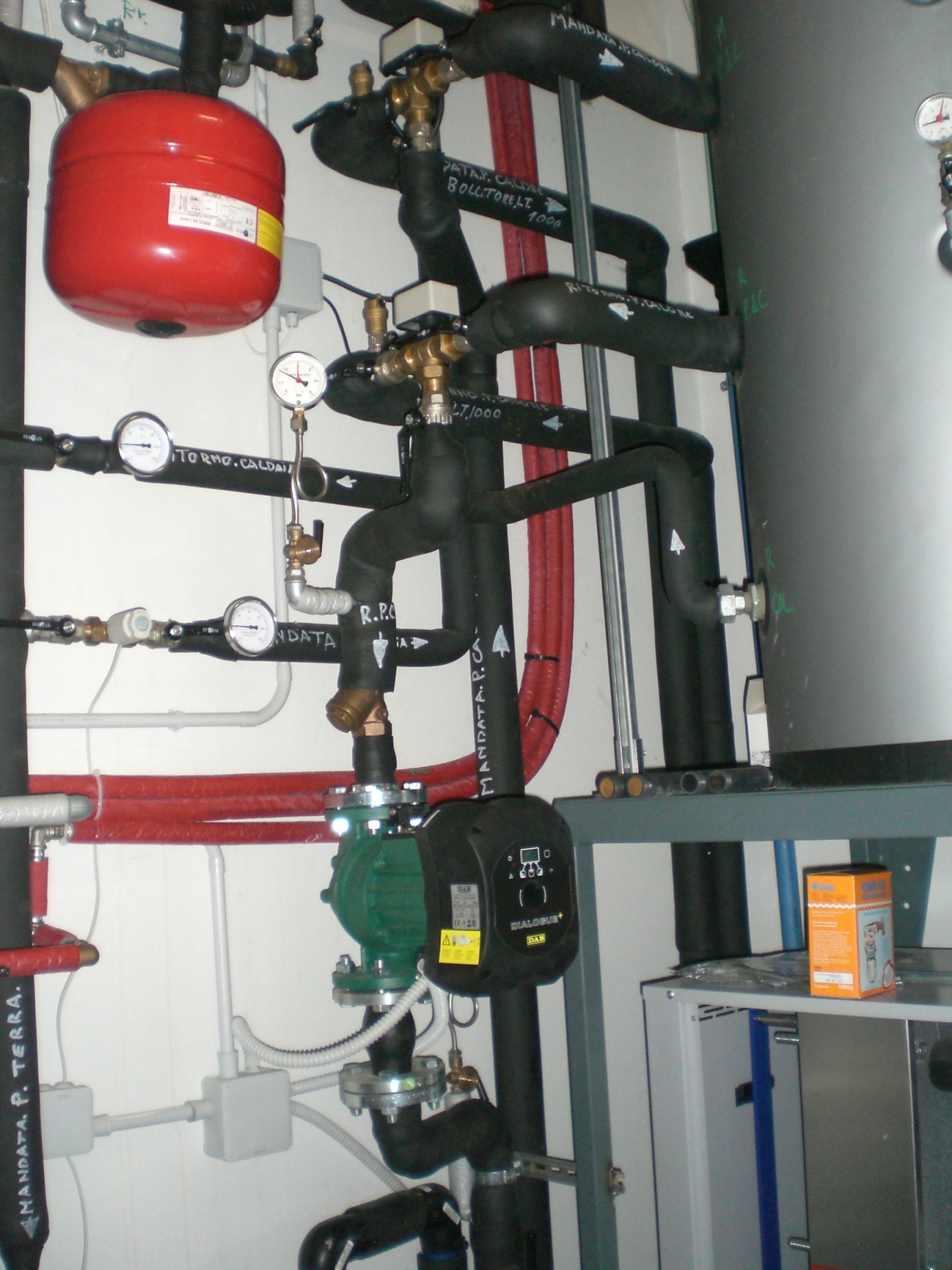 L’impianto di tipo classico installato al primo piano è costituito da un pannello a pavimento preformato, libero da clorofluorocarburi, riciclabile, composto da un foglio in polistirene antiurto rigido, su isolante in polistirene ad alta densità, tubazioni in polietilene reticolato PE-Xa con barriera antiossigeno e massetto in calcestruzzo trattato con additivo fluidificante. Al secondo piano, invece, è stato previsto un pannello radiante a soffitto costituito da pannello in gesso rinforzato, accoppiato a isolante in EPS con tubazione in polietilene reticolato integrata con barriera antiossigeno. L’integrazione degli impianti avviene automaticamente quando la temperatura esterna scende al di sotto dei valori limite di temperatura, oltre i quali il COP decade; in quel caso avviene uno ‘spillamento’ dell’acqua calda ad alta temperatura prodotta dalla caldaia nell’impianto a bassa temperatura. In questo modo viene garantito il massimo rendimento dell’impianto, a prescindere dalle condizioni climatiche esterne. Poiché l’impianto prevede anche la produzione di acqua calda sanitaria, anche in questo caso viene prevista l’integrazione automatica del fluido termovettore prodotto dalla caldaia nei periodi di picco, in cui si verifica il maggior fabbisogno di ACS.