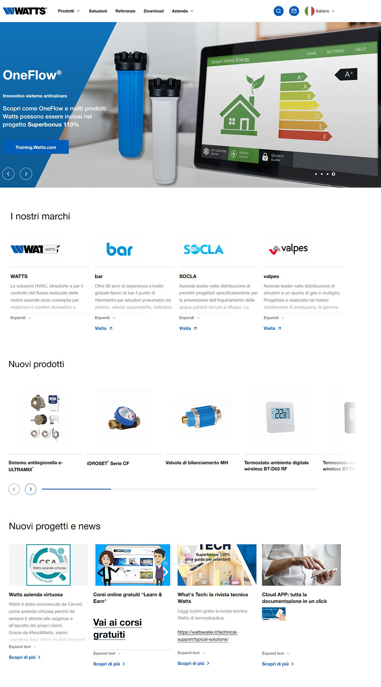 sito WattsÈ on-line il nuovo sito Watts, rinnovato nella grafica e arricchito di contenuti e sezioni con una modalità di navigazione più semplice, intuitiva e di rapida consultazione. La struttura si presenta nell’home page con i menu principali: Prodotti, Soluzioni, Referenze, News e Azienda.