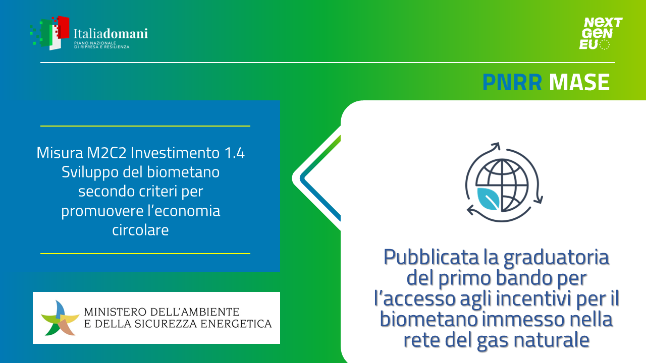 È stata pubblicata sul sito del GSE, nell’ambito della Misura M2C2, Investimento 1.4 del PNRR “Sviluppo del biometano secondo criteri per promuovere l’economia circolare”, la graduatoria relativa alla prima procedura competitiva per l’accesso agli incentivi finalizzati a supportare la realizzazione di nuovi impianti per la produzione di biometano e la riconversione a biometano di impianti di biogas agricoli esistenti.